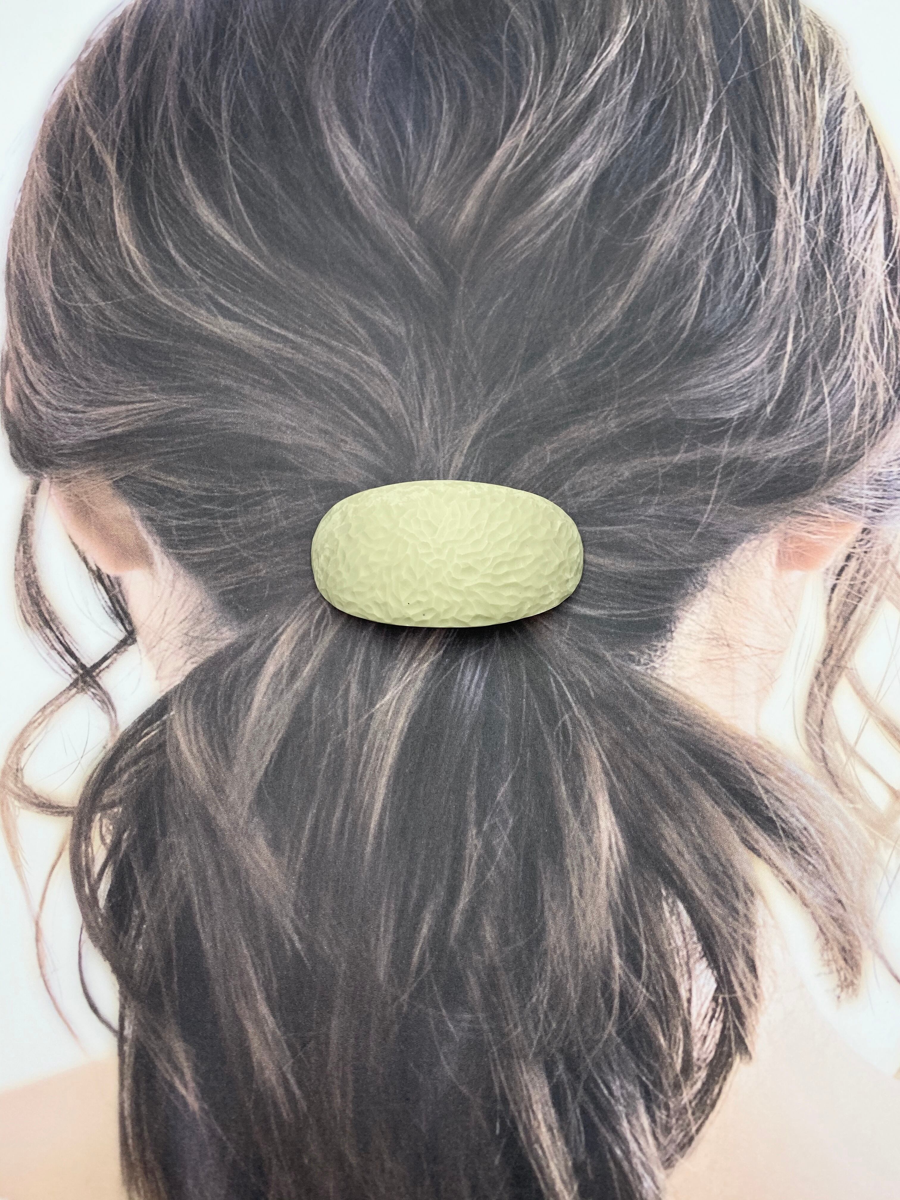 表面に模様のある、楕円形で曲がったかたちのヘアゴムです。