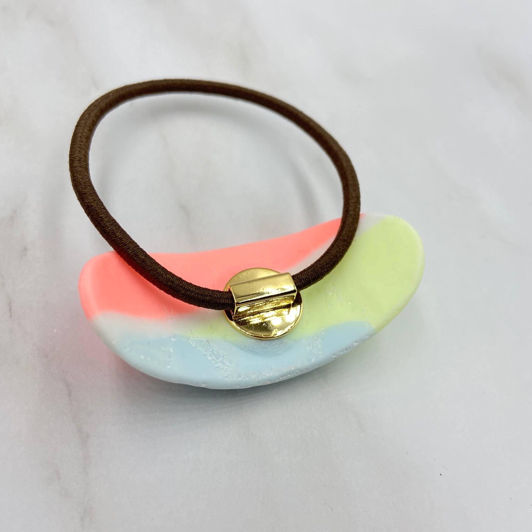 ころんとした丸みのある、表面に模様のある楕円形のヘアゴムです。