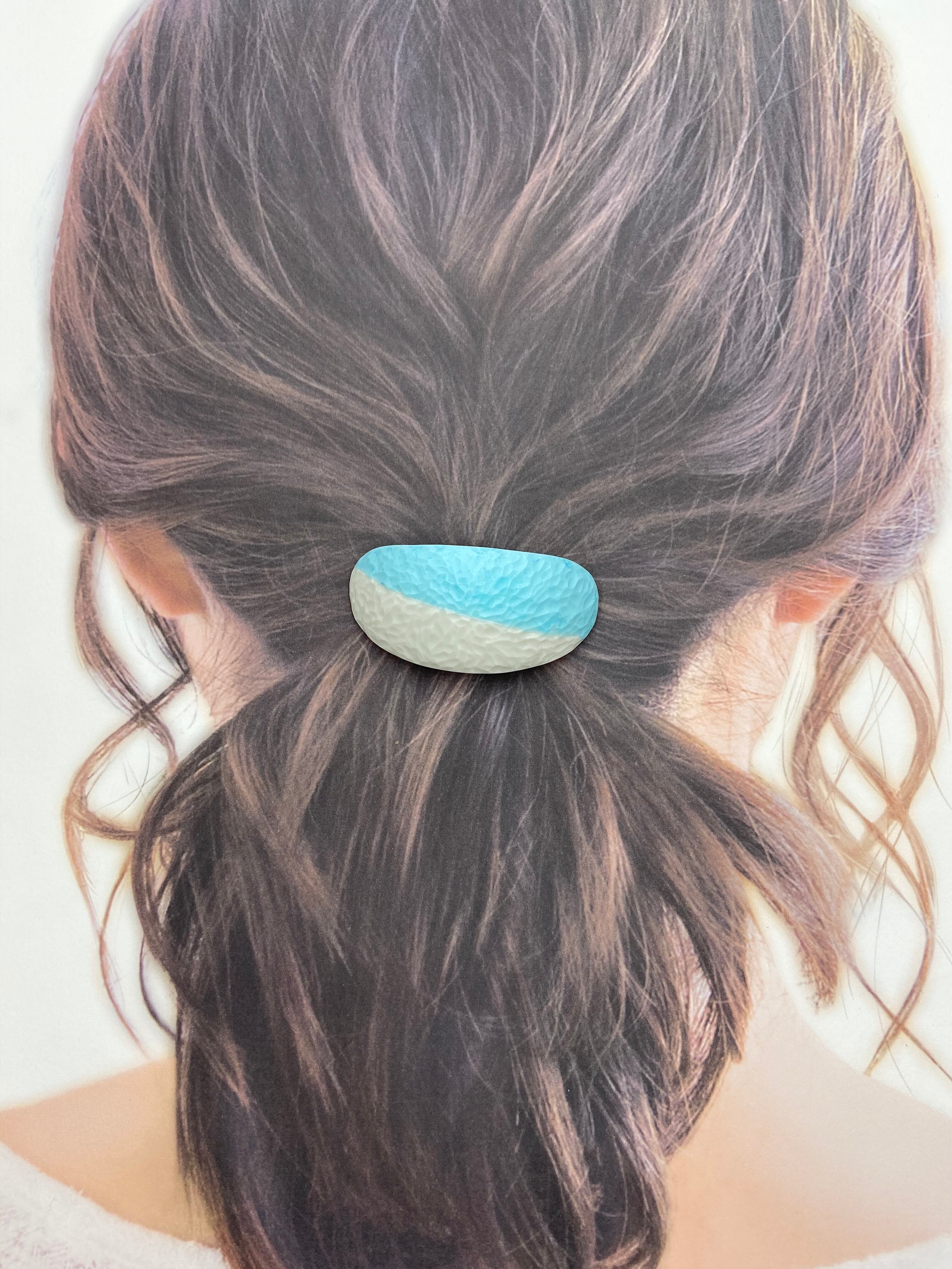 ころんとした丸みのある、表面に模様のある楕円形のヘアゴムです。