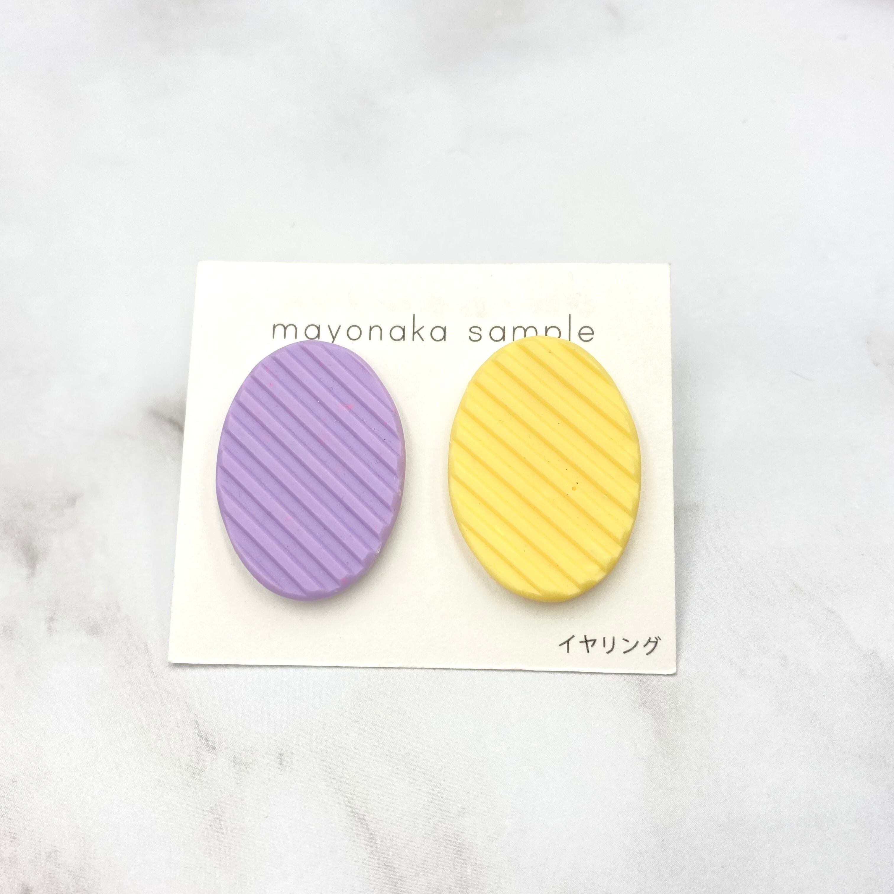表面がボーダー模様の楕円形のイヤリング(ピアス)です。