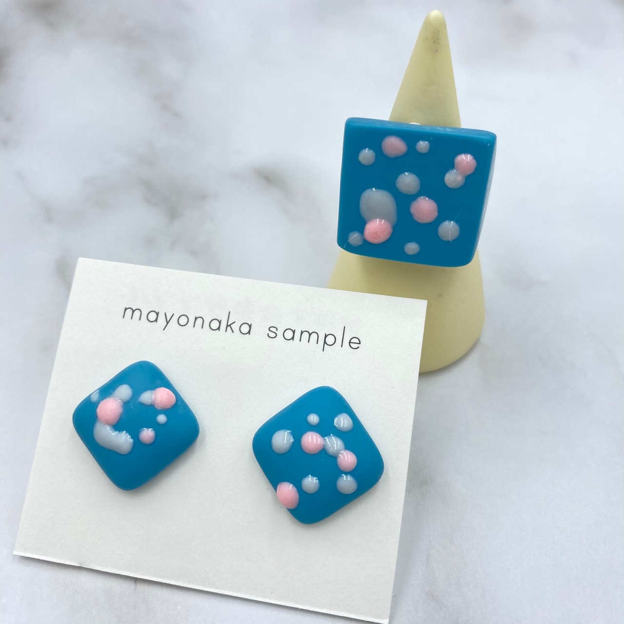 つやのあるドット模様のイヤリング(ピアス)と指輪のセットです。